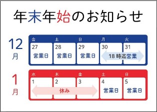 12月28日土曜日入荷しました。12月30日、31日は18時まで営業しています。